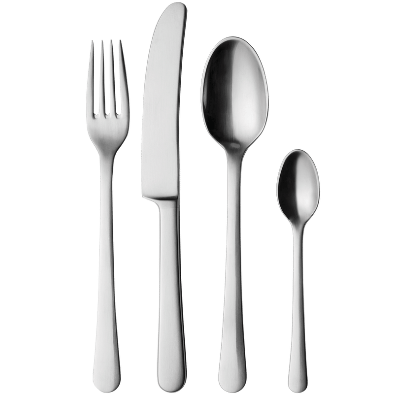 Settet inkluderer fire matskjeer (200mm), fire matgafler (200mm), fire matkniver (220mm) og fire teskjeer (137mm), alle nøye utformet for å gi en balansert og behagelig spiseopplevelse. Hver del er produsert i matt rustfritt stål, kjent for sin holdbarhet og enkle vedlikehold. Den matte overflaten tilfører en sofistikert og moderne touch, samtidig som den er robust nok til daglig bruk.