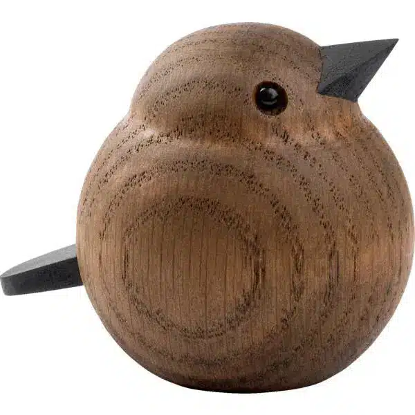 Hver Mini Spurv er nøye utformet av massiv eik, behandlet med en røykbeis som gir den en særegen og tiltalende farge. Denne prosessen fremhever treets naturlige årringer og gir hver figur et unikt uttrykk. Med målene 50 x 48 x 58 mm, er denne lille spurven en diskret, men likevel bemerkelsesverdig tilføyelse til ditt interiør.
