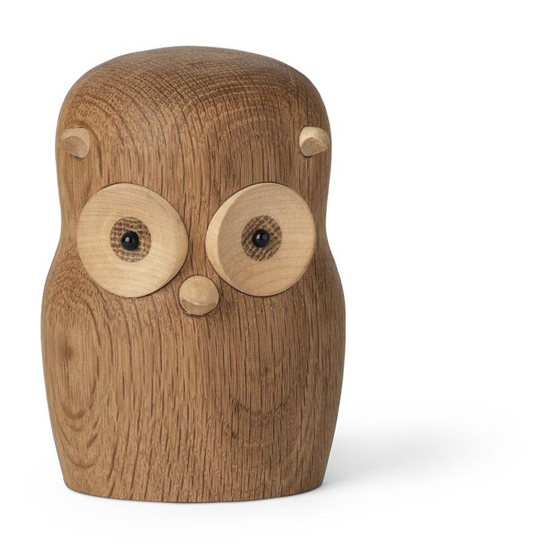 Denne hornuglen er nøye utformet fra høykvalitets eiketre, kjent for sin holdbarhet og vakre åretegninger. Med sin stående høyde på 12 cm, er den ideell for å skape et blikkfang uten å dominere plassen den blir plassert i. Den detaljerte utformingen og den levende karakteren til uglen gjør den til et naturlig samtaleemne og en berikelse for hjemmets atmosfære.