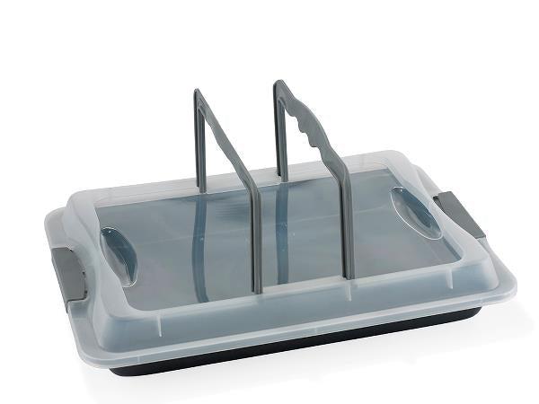 Funksjon Bradepanne med Lokk er en essensiell kjøkkenutstyr for enhver matentusiast. Denne ovnformen er designet for å møte alle dine behov for matlaging og baking, enten det er hverdagsmiddager eller festlige anledninger. Med en generøs størrelse på 42 cm i lengde og 29 cm i bredde, gir den rikelig med plass til å tilberede alt fra saftige kaker til smakfulle lasagner.