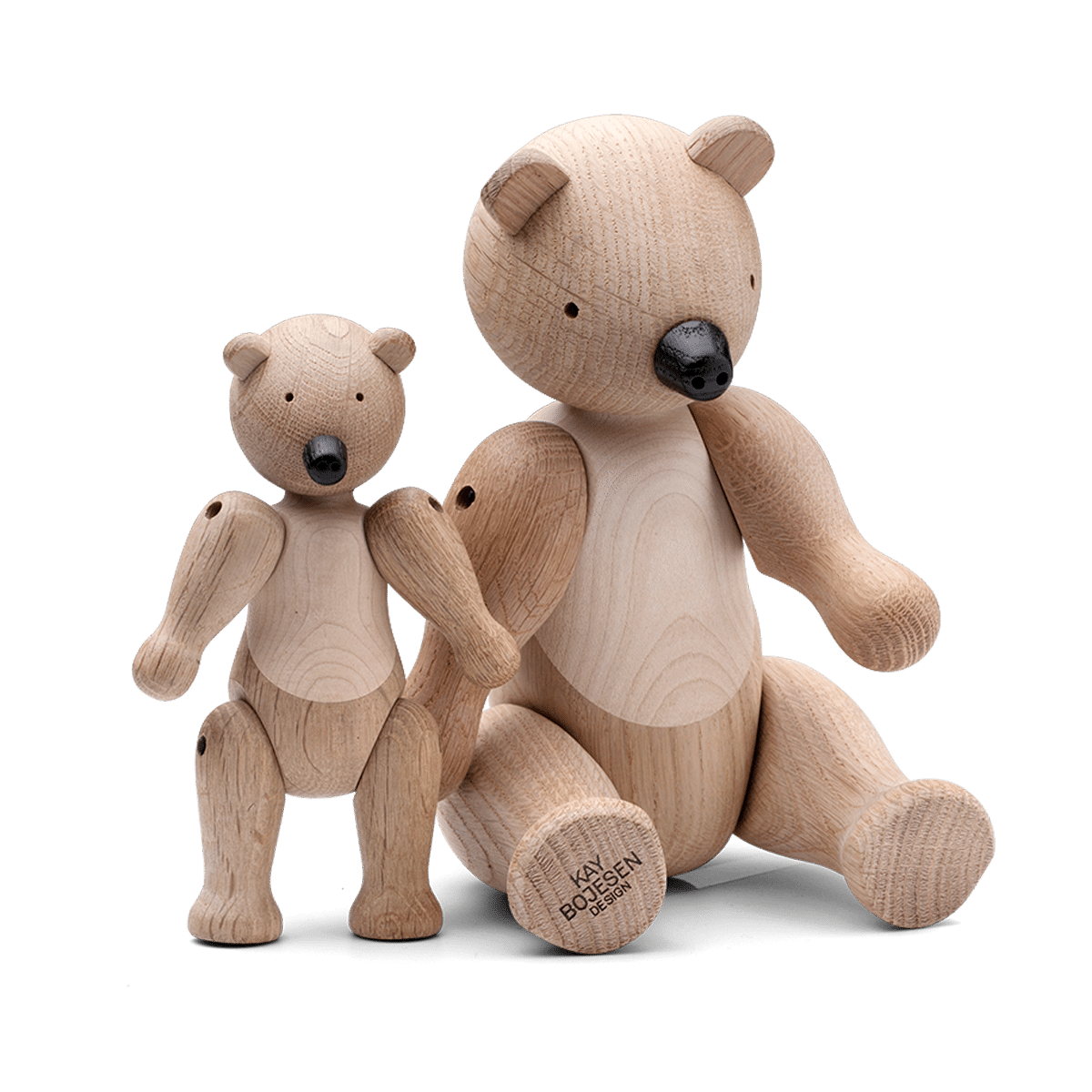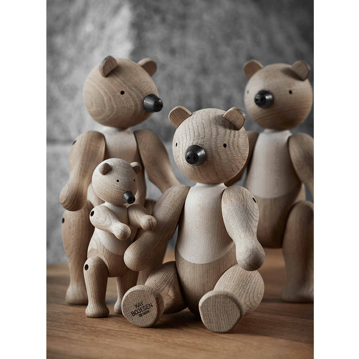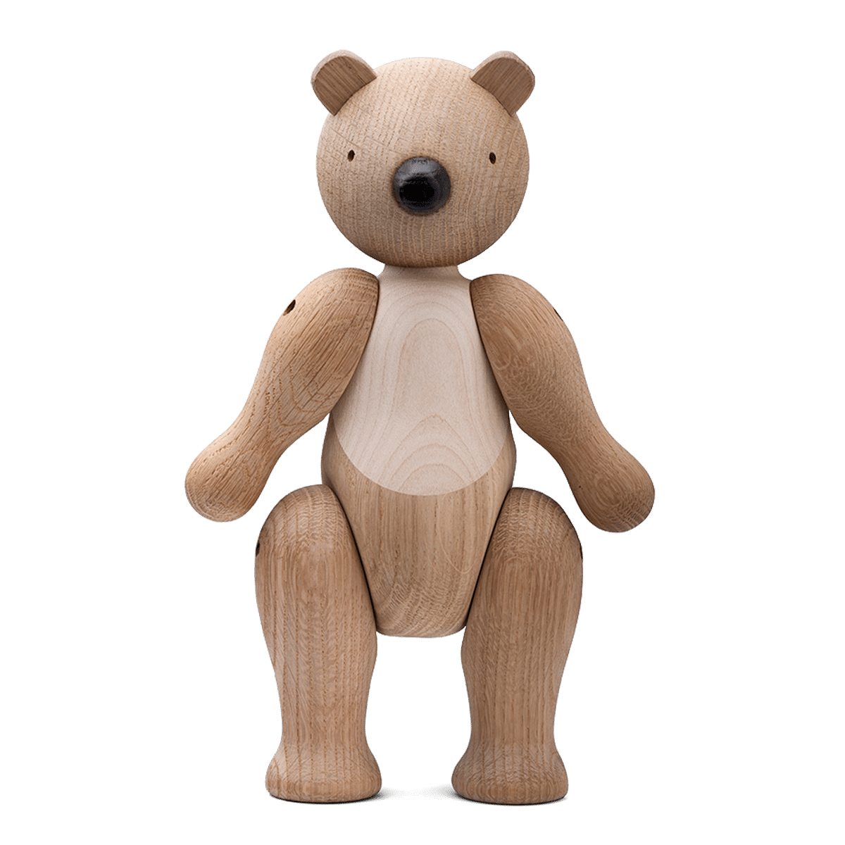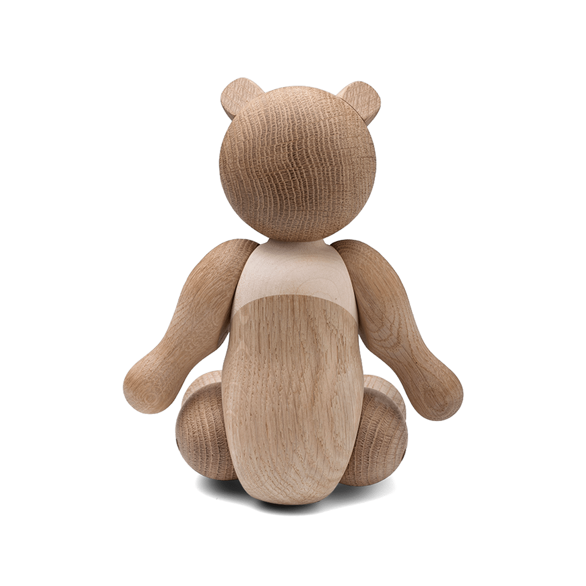 Hver bjørn er nøye utformet fra høykvalitets eik og lønn, og står 25 cm høy, noe som gjør den til en perfekt størrelse for å fange oppmerksomheten uten å dominere rommet. Den naturlige finishen på treverket fremhever de fine detaljene og den glatte teksturen, og sikrer at bjørnen passer inn i et bredt spekter av interiørstiler, fra det moderne til det mer tradisjonelle.